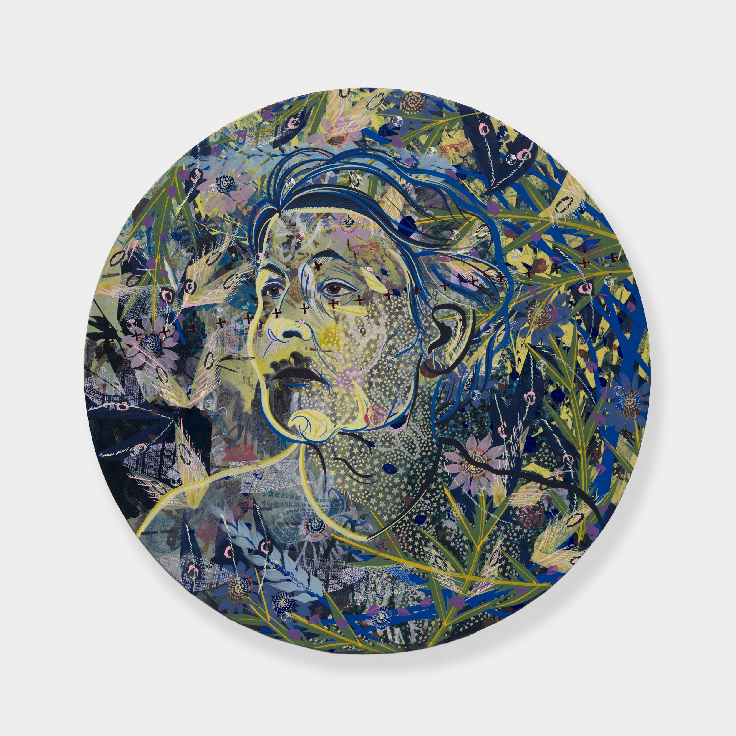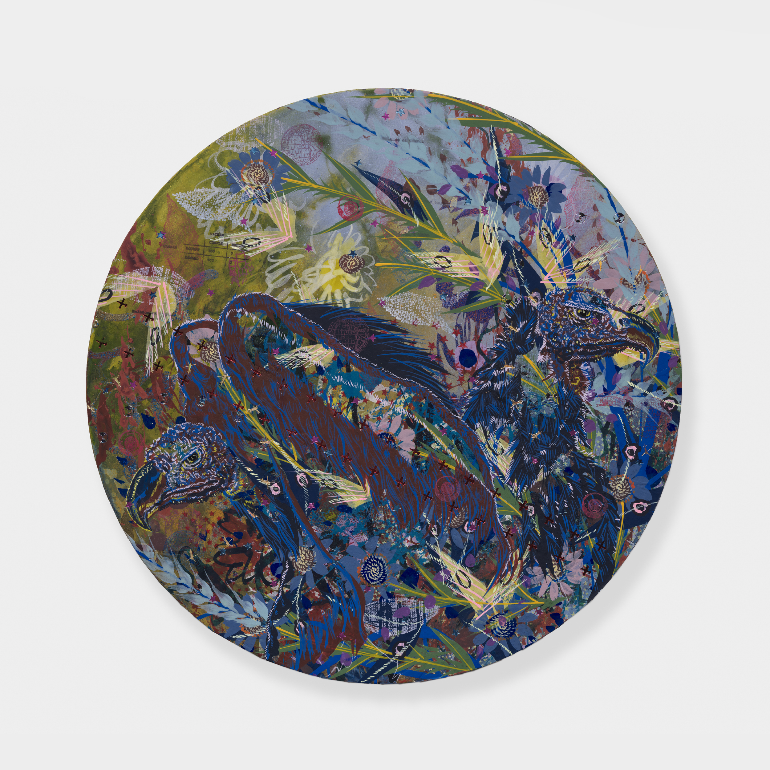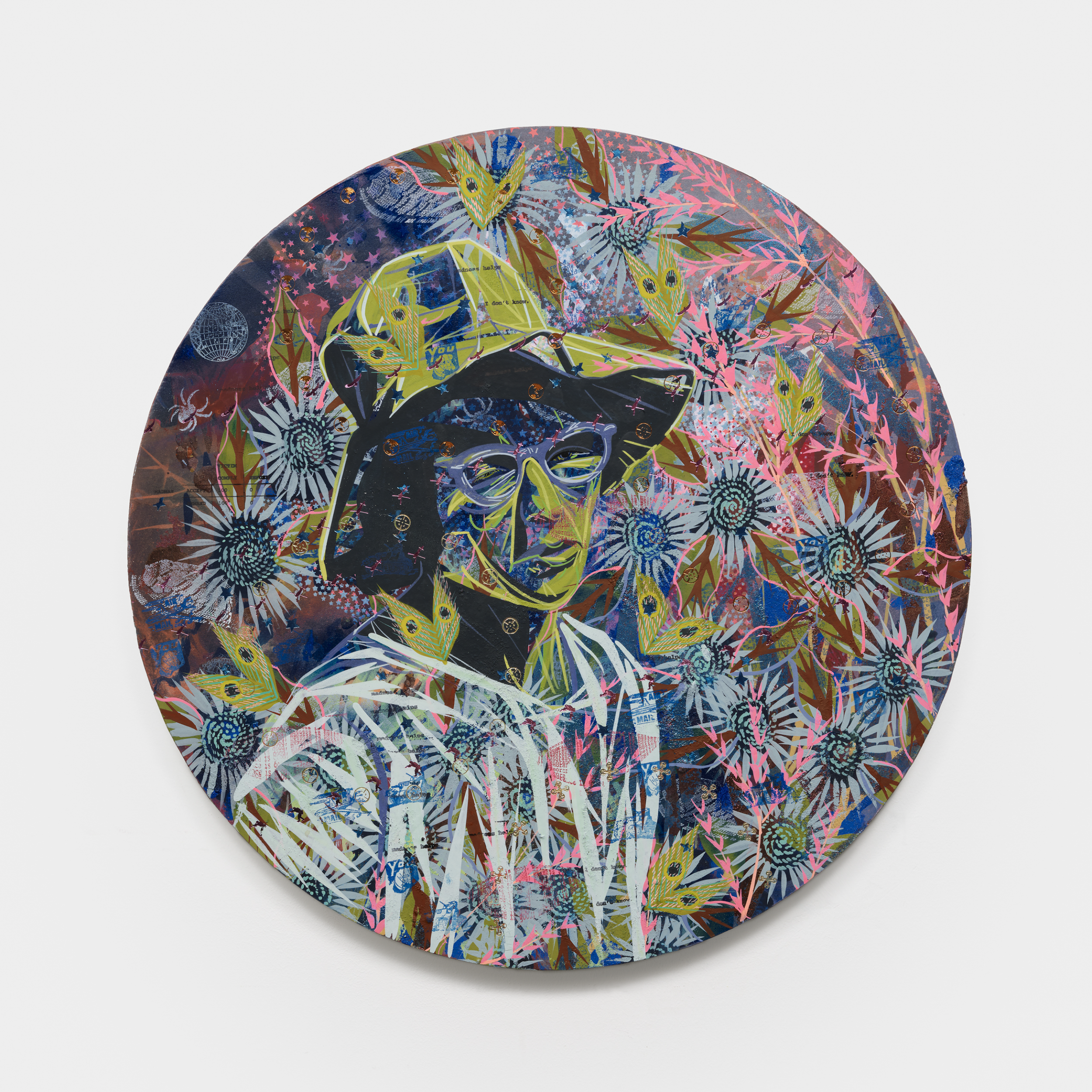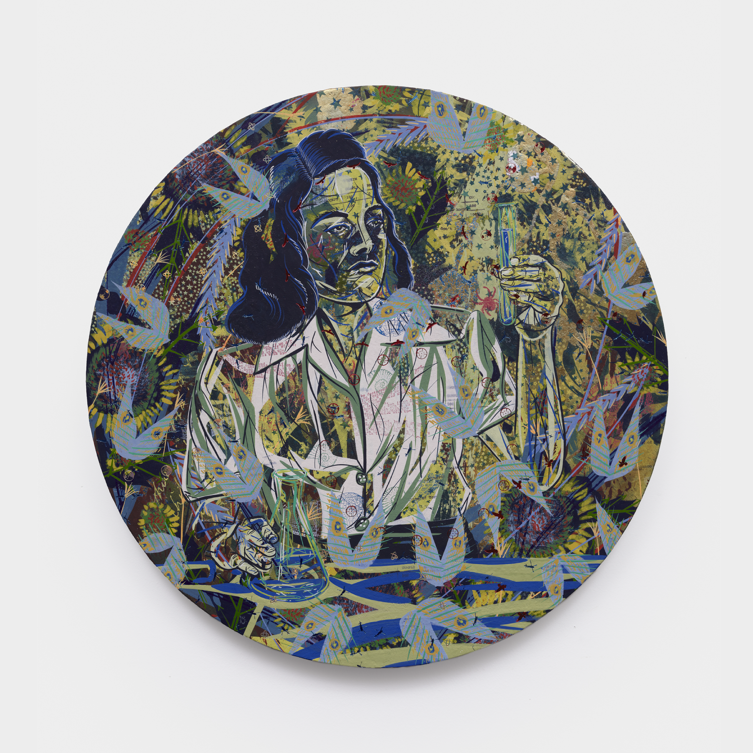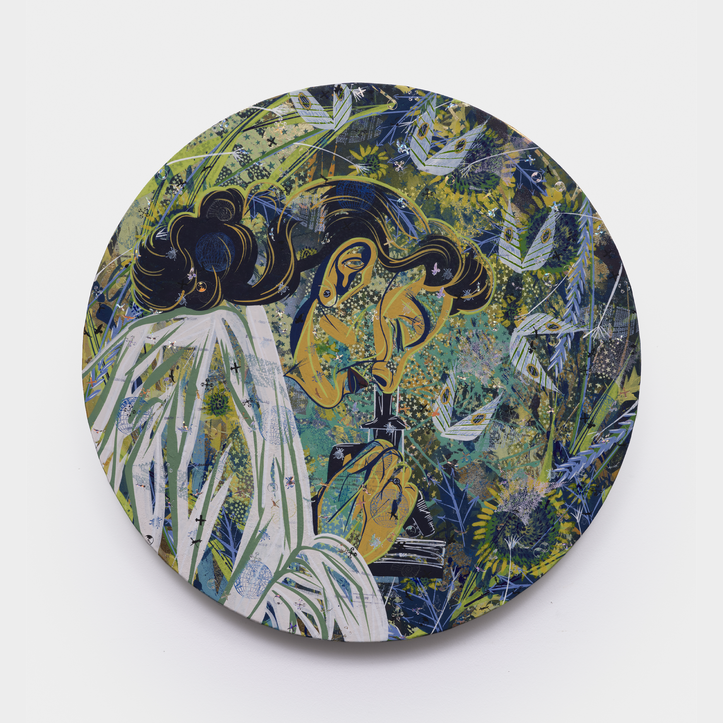 Her interdisciplinary inquiry informs nine new circular paintings that serve as portals into imagined, fractured worlds.